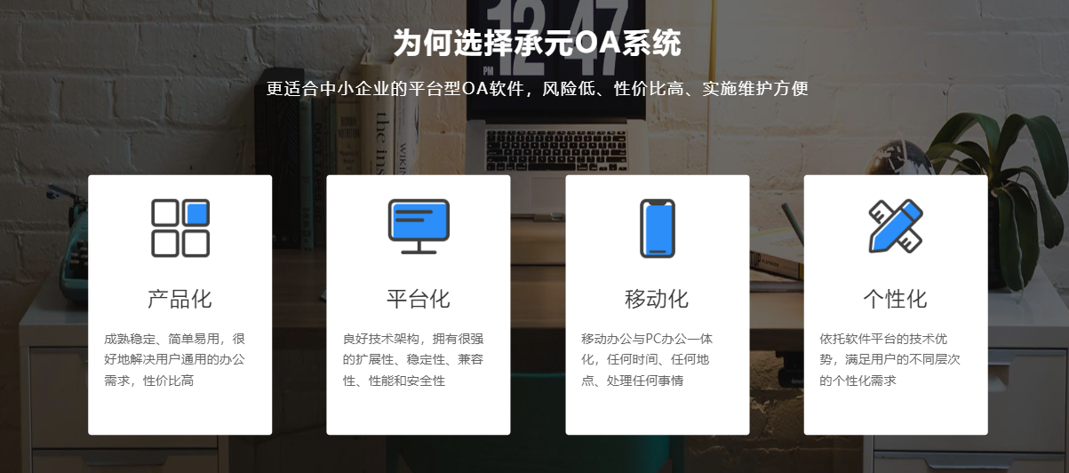 承元软件是集企业办公与业务管理于一体的综合管理平台,针对不同行业、不同用户的管理需求,将先进的企业管理思想与软件技术相结合,其OA产品分类有企业版、移动版、政务版和CRM版,承元OA是更适合中小企业的平台型OA软件,风险低、性价比高,实施维护更加方便。