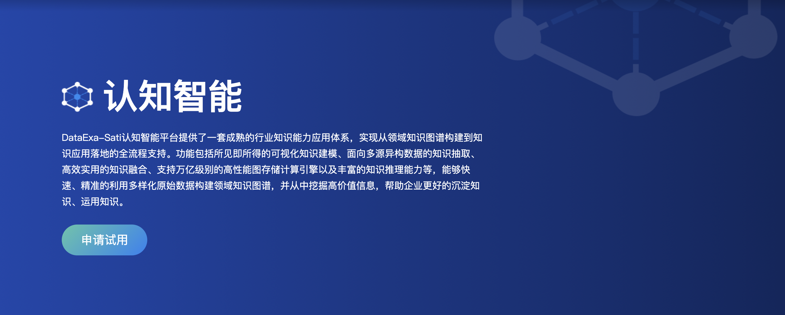 DataExa-Sati认知智能平台提供了一套成熟的行业知识能力应用体系,实现从领域知识图谱构建到知识应用落地的全流程支持。功能包括所见即所得的可视化知识建模、面向多源异构数据的知识抽取、高效实用的知识融合、支持万亿级别的高性能图存储计算引擎以及丰富的知识推理能力等,能够快速、精准的利用多样化原始数据构建领域知识图谱,并从中挖掘高价值信息,帮助企业更好的沉淀知识、运用知识。