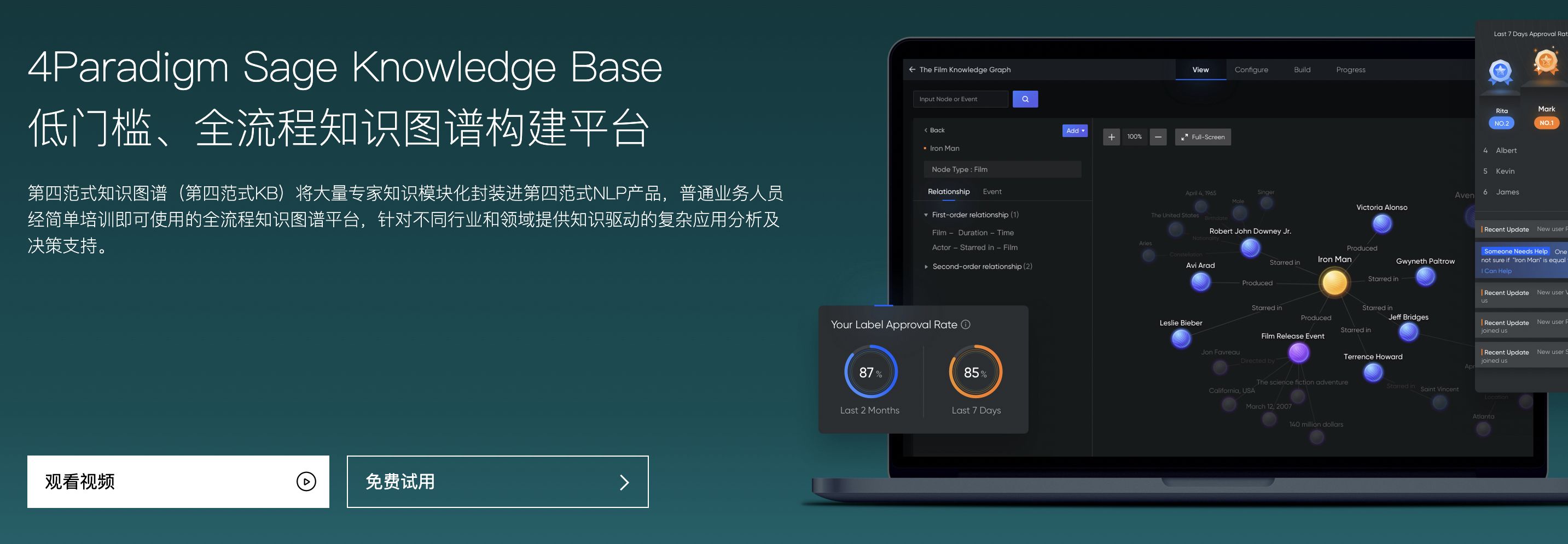 4Paradigm第四范式知识图谱是一个低门槛、全流程知识图谱构建平台,将大量专家知识模块化封装进第四范式NLP产品,普通业务人员经简单培训即可使用的全流程知识图谱平台,针对不同行业和领域提供知识驱动的复杂应用分析及决策支持。