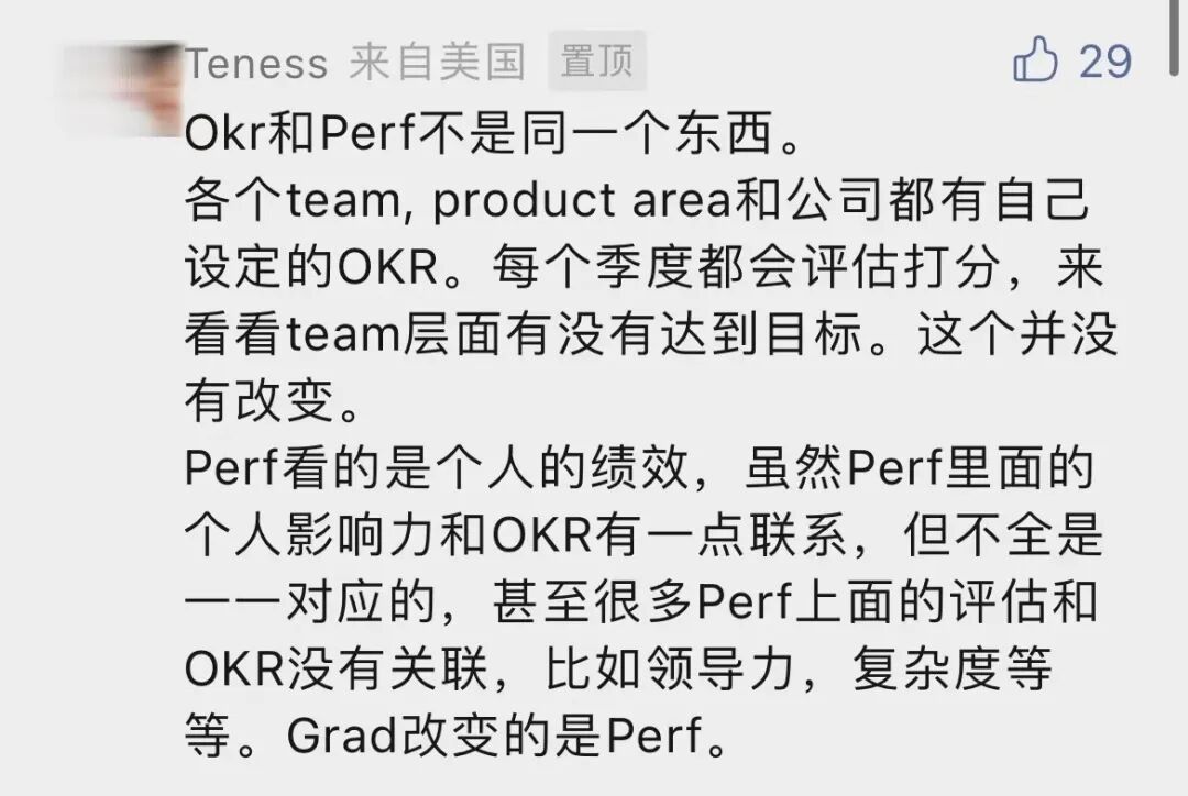 ① Okr和Perf不是同一个东西。OKR是目标管理工具,即各个team,product area和公司都有自己设定的OKR。每个季度都会评估打分,来看看team层面有没有达到目标。这个并没有改变。