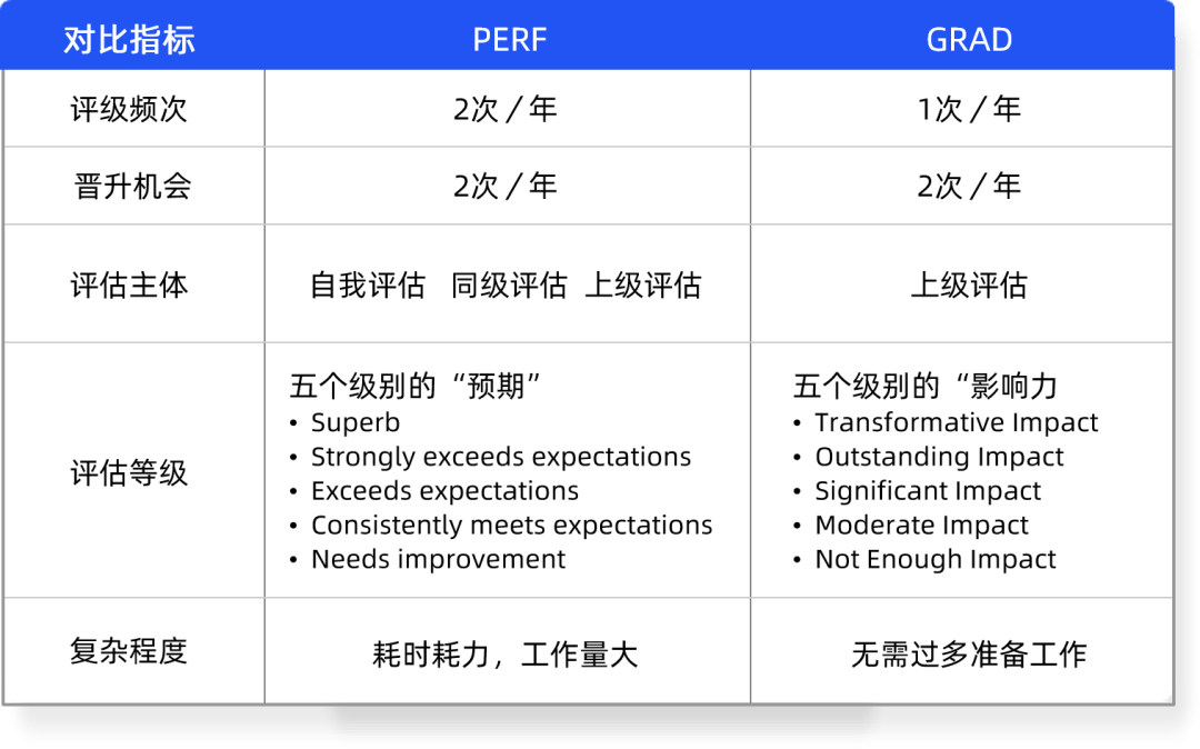 而在GRAD与Perf的差异上,从下图可以看出GRAD追求是“Simplification of Work”,即简化工作追求效率最优化,比如在评估频次及评估主体上都进行了缩减……