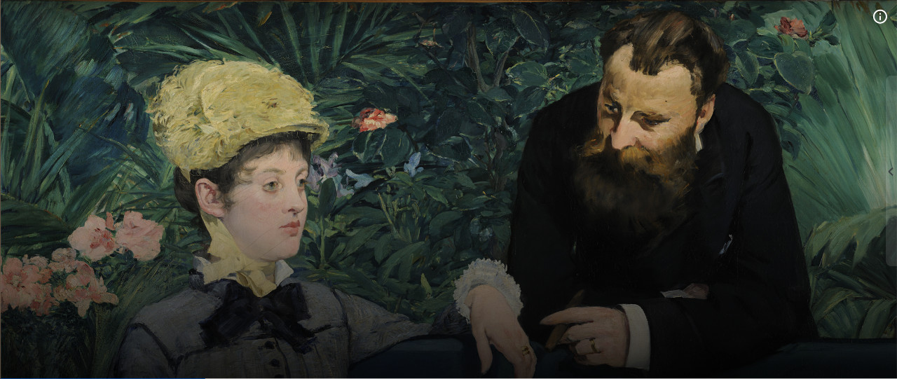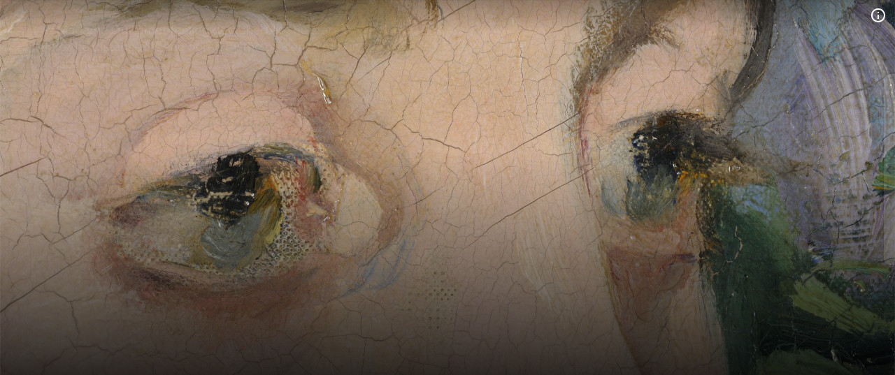 在文物扫描中,根据文物的不同特质和需求分为2D、2.5D和3D。大部分的油画扫描2.5D就已足够, 在原有画面的基础上能有效保留还原画布与颜料的凹凸感。例如Google Art & Culture上的爱德华.马奈的《在花房里》,不断放大后能清晰看到主人公眼中画布的点状质感和时间流逝造成的颜料裂纹。