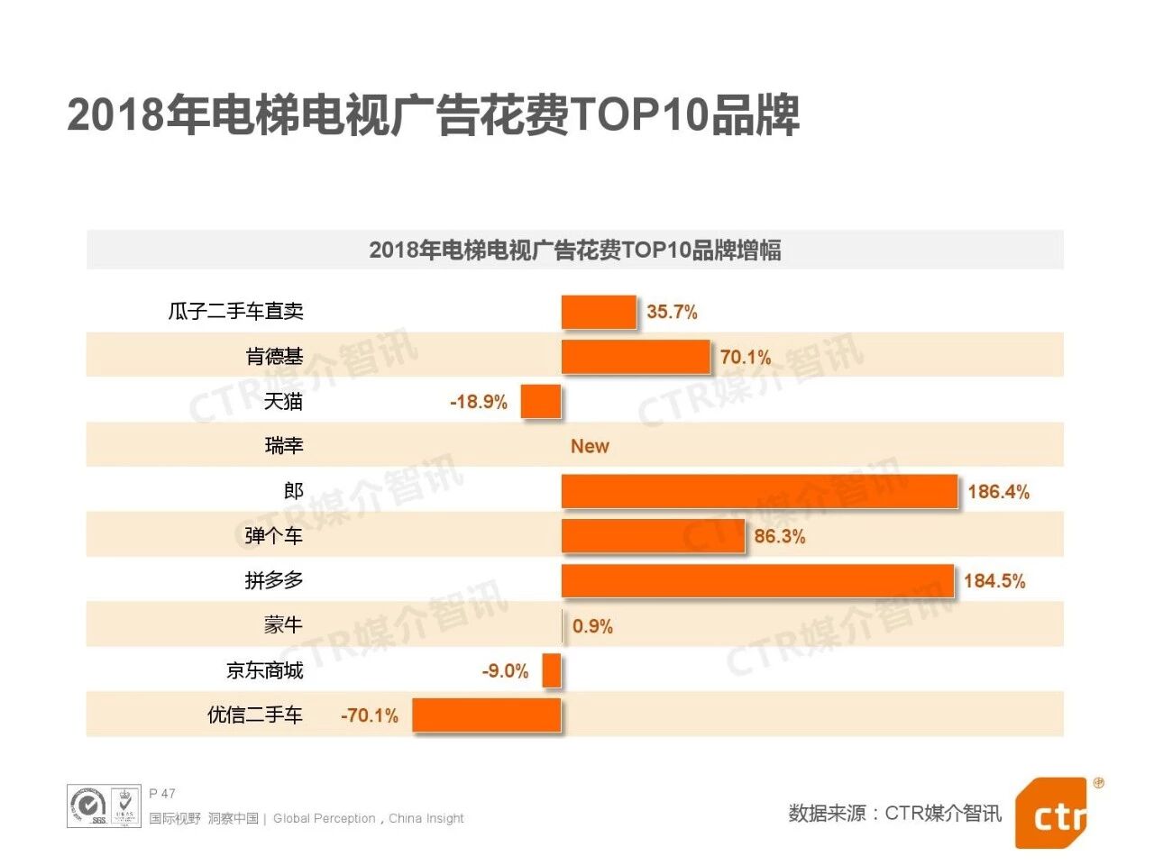 来自CTR媒介智讯数据显示,2018年电梯电视广告刊例收入同比增长23.4%,排名前十的品牌中,虽瓜子、弹个车、拼多多等投入增加,并出现了瑞幸咖啡这一新品牌,但天猫、京东商城、优信二手车投入下滑。