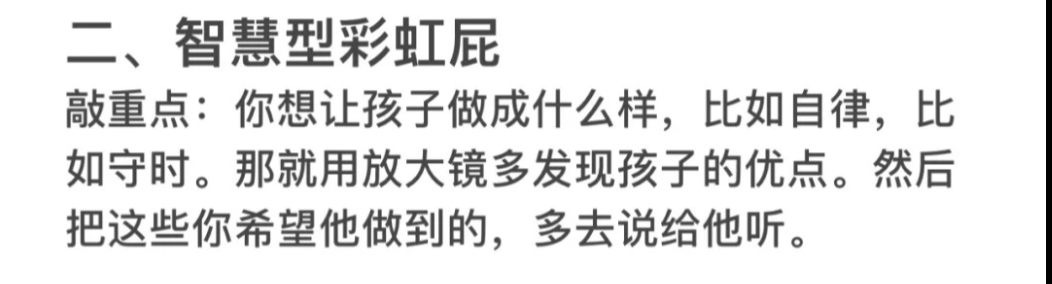 智慧型彩虹屁,想要孩子做成什么样,就一直告诉他。比如:“妈妈发现你今天写作业时,先把学习用品书都准备好了再开始的,这就是做事有条有理。”