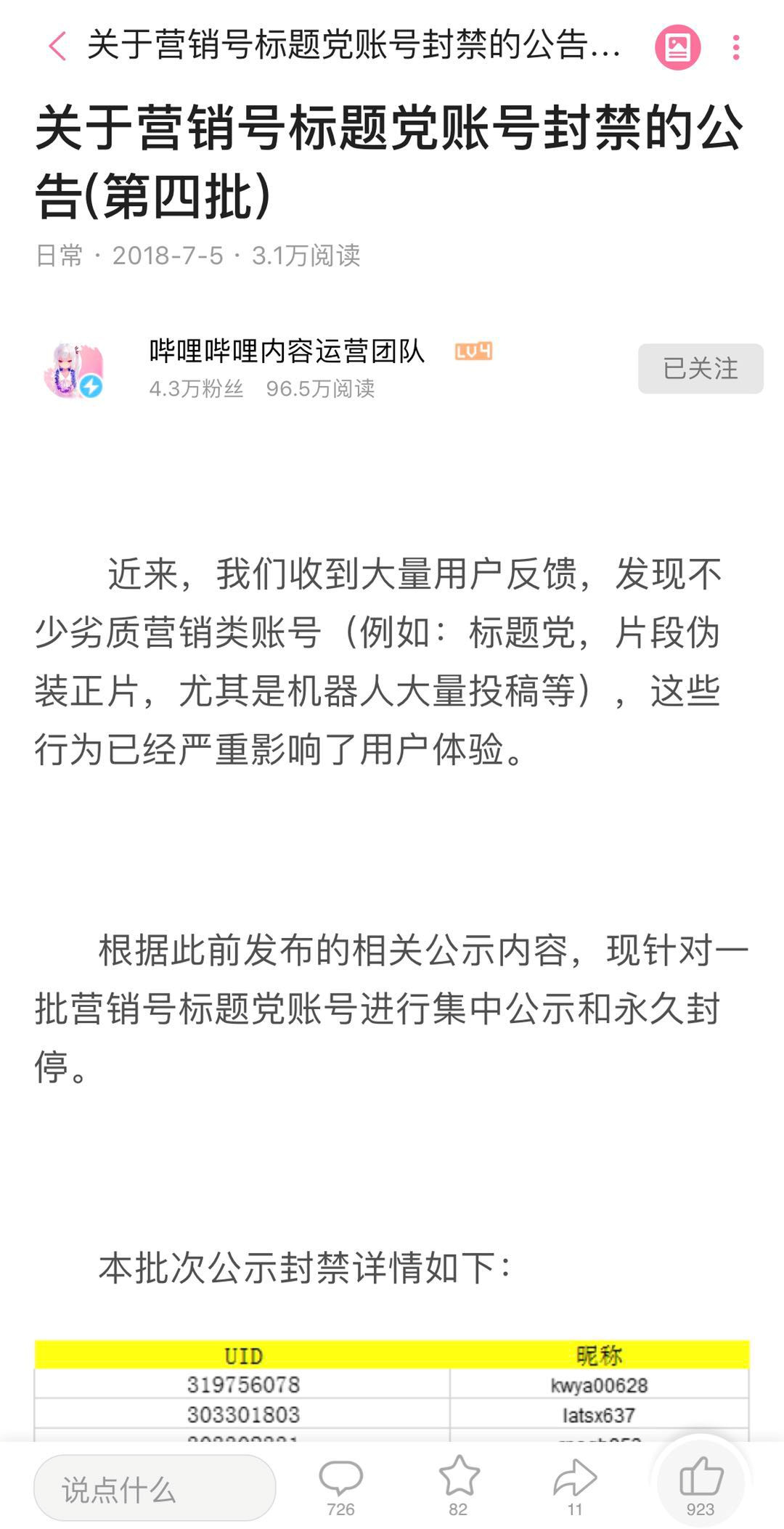 很快,哔哩哔哩内容运营团队就封禁了4批营销号标题党账号,并对相关案例进行公示。