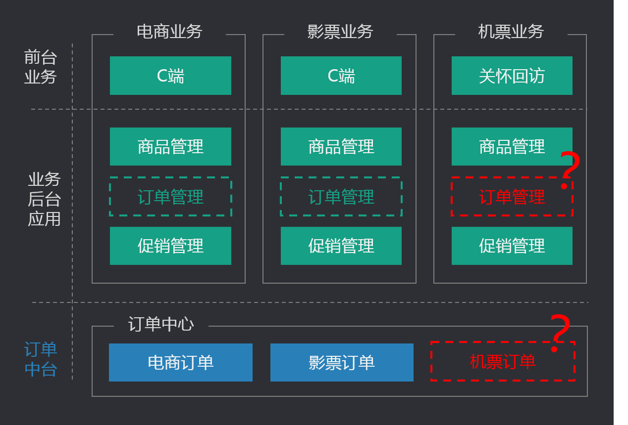可见,订单中心,在不同业务模式下,并不一定适用于中台化建设,设计人员要有足够的思辨能力,判断产品形态上是否值得抽象下沉,是否能够提供复用能力。然而这也是软件工程设计中非常难的部分。