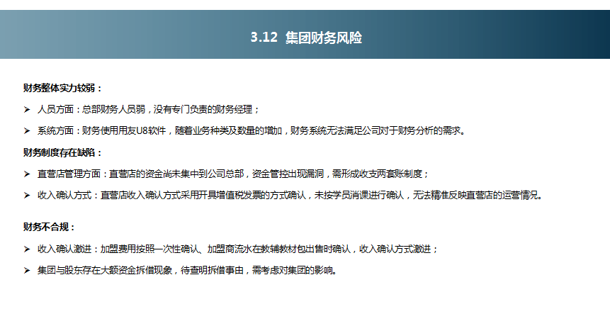 财务制度容易形成缺陷,包括货币管理制度和收入确认方式制度,后者往往是由于无法及时及精准计算销课或有意进行税收筹划的原因发生;收入确认激进以及集团与创始人资金往来不清晰:前者是管理层的要业绩的原因,导致与会计准则不一致的收入确认方式;后者是培训行业的普遍现象,更有甚者,企业一方面想融资,另一方面仍坚守着公私两套账的做账方式,不愿意在前期进行财务规范化,这样只会导致后期的企业管理问题越来越大。