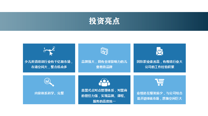 一般第一页会有一个投资亮点的抓取,在经过对于公司及行业的整体了解之后,会对行业赛道、公司在教学体系、品牌、团队、管理制度、财务状况、商业模式等有一个亮点提取,算是对这个企业的肯定。