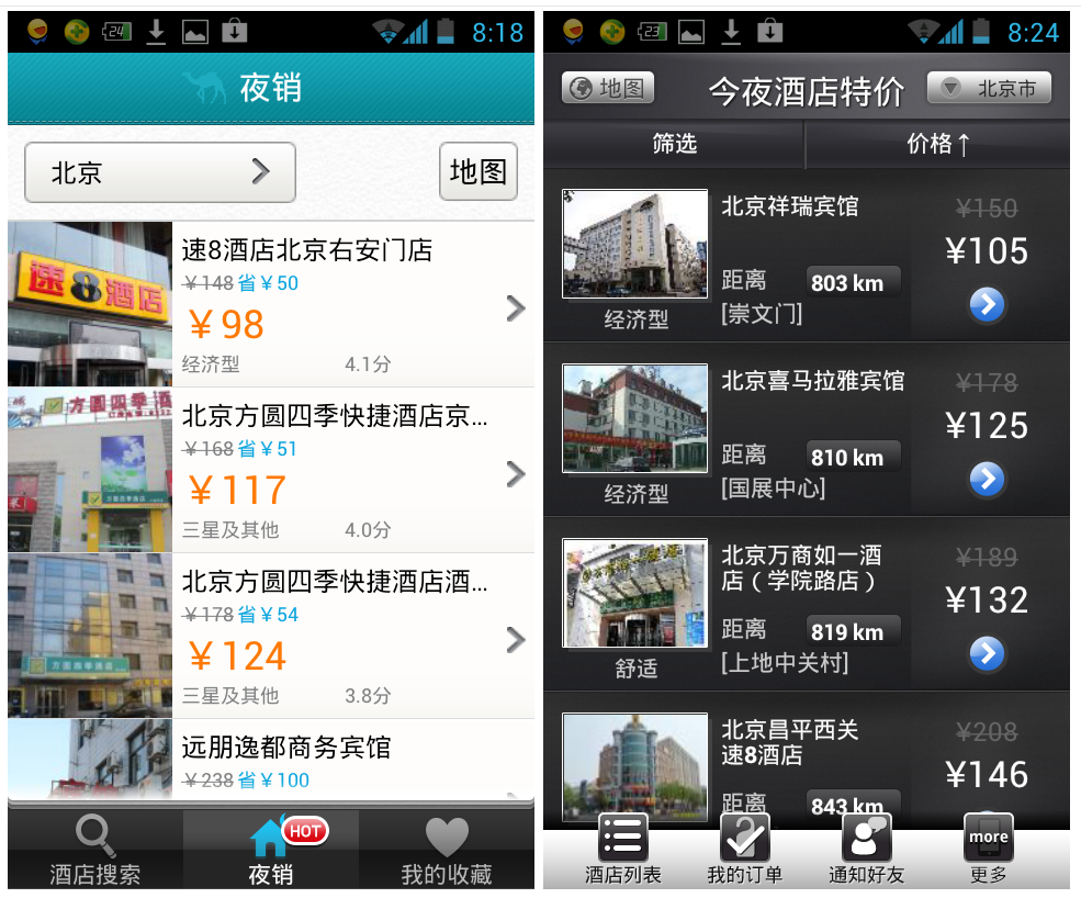 和今夜酒店特价应用比较,去哪儿的“夜销”还不支持应用内支付。另外,从覆盖的城市来看,今夜酒店特价覆盖了9大城市,去哪儿夜销覆盖7大城市,但是两者都已经覆盖北上广深四大城市。